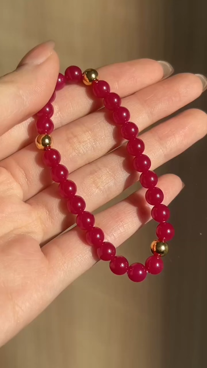 This bracelet features lustrous ruby beads with a rich, vivid red glow, paired with delicate golden beads.Rubies stand for love and courage, while gold beads symbolize protection and blessing.It brings the wearer lucky energy and gentle confidence.